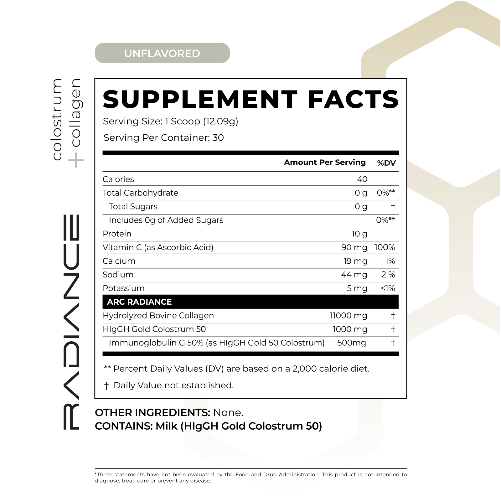 ARC Radiance is a comprehensive daily supplement formulated to support foundational wellness from the inside out. Featuring Grass-fed hydrolyzed Type I & III collagen peptides and 50% IgG-rich bovine colostrum, this blend promotes gut lining integrity, healthy digestion, immune resilience, and the health of skin, joints, hair, and nails.